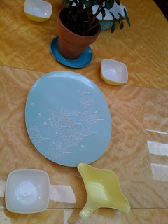 (Vintage Milkglass platter, Glasbake, 1950's / Yellow ramekins, Pyrex, 1950's / Assorted 1950's Melamine serving pieces in canary yellow and "The Color" )